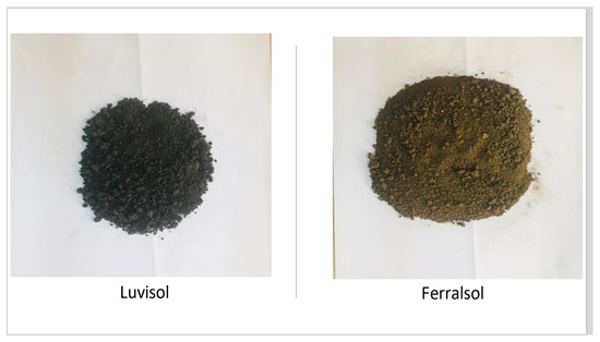 The two soils (Figure 1) used in this study were collected from the University of KwaZulu-Natal Research Farm, Ukulinga (29°39′33.9″ S; 30°24′14″ E), and Bulwer (29°48′ 27″ S; 29°45′35″ E). Ukulinga receives a mean annual precipitation of 750 mm, while Bulwer receives 877 mm. The soil from Ukulinga was under natural vegetation and was classified as Bonheim form [25], which was translated to Luvisol according to the IUSS Working Group WRB [26]. The soil from Bulwer was used for maize production and was classified as a Clovelly form [25] and translated to Ferralsol according to the IUSS working group WRB [26]. Bulk soil samples were collected from 0–20 cm depth, mixed, homogenised, air-dried and sieved (<2 mm), before analysis. The soils were analysed for pH in 1 M KCl, as described by the Non-Affiliated Soil Analysis Work Committee [27]. Phosphorus was extracted with the AMBIC-2 method [28] and analysed with a UV/VIS spectrophotometer following the molybdenum blue method [29]. Total carbon (C) and nitrogen (N) were measured using the LECO Trumac CNS Autoanalyser [30]. Exchangeable bases (calcium, Ca2+; magnesium, Mg2+; potassium, K+; and sodium, Na+) were extracted using the ammonium acetate (pH 7) method followed by analysis with atomic adsorption spectrophotometry (Varian 2600). Exchangeable acidity was extracted with 1 M KCl, followed by titration with 0.1 M NaOH with phenolphthalein indicator, as described by Lourenzi [31]. The characteristics of the soils are shown in Table 1. Both soils were acidic, with the Luvisol having lower exchangeable acidity, extractable P, and extractable K and higher clay content and exchangeable Ca and Mg than the Ferralsol.