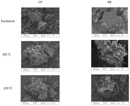 Morphological comparison of 4 studied biochars and their feedstocks at different pyrolysis temperatures using scanning electron microscopy. CP = cull potato waste; PB = pine bark.