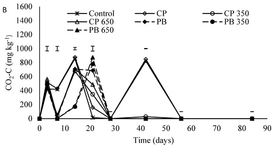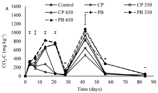 In the Ferralsol, the CO2-C emission in the control and CP treatments was higher after 7, 14, and 42 days and lower after 21 days than in all other treatments (Figure 3B). The CO2-C from treatments with biochar from PB (PB350 and PB650) was lower after 14 days and higher after 21 days compared to other treatments. After 21 days, addition of PB and its biochar to the Ferralsol resulted in higher CO2-C than CP and its biochar (CP350, CP650), and, in both cases, the emissions were increased by higher pyrolysis temperature (Figure 3B). The CO2-C rapidly declined between 14 and 28 for CP and its biochar and between 21 and 28 days for PB and its biochar. Beyond 28 days, the emissions remained low, except for those of the control and CP, which reached another peak after 42 days, after which there was a sharp decrease to day 56 and 84, where CO2-C was below detection for all treatments.