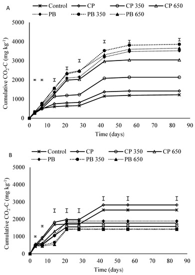 The delayed peak in treatments with pine bark (PB) biochar in both soils could have been because of lower acid-neutralising power (CCE). The explanation for low CO2-C after 28 days of incubation for all treatments in both soils is the result of moisture, as watering was skipped during this day due to COVID-19 restrictions imposed on accessing the laboratory. However, the stabilisation in cumulative CO2-C emission beyond 42 days of incubation (Figure 4A,B) could have been due to depletion of the labile C for microorganisms with the increase in incubation period.