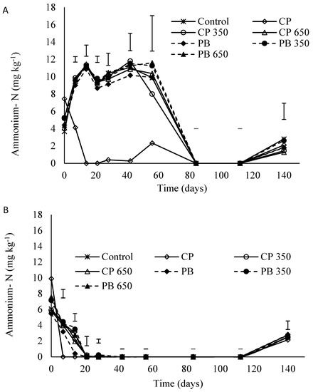 Concentrations of ammonium-N during incubation of Luvisol (A) and Ferralsol (B) amended with biochar from cull potato (CP) and pine bark (PB) produced at varying pyrolysis temperatures. CP = cull potato; PB = pine bark; CP 350 = cull potato biochar at 350 °C; CP 650 = cull potato biochar at 650 °C; PB 350 = pine bark biochar at 350 °C; PB 650 = pine bark biochar at 650 °C. The vertical error indicates LSD (p < 0.05).