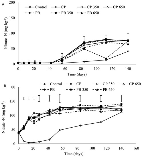 Concentrations of nitrate−N during incubation of Luvisol (A) and Ferralsol (B) amended with biochar from cull potato (CP) and pine bark (PB) produced at varying pyrolysis temperatures. CP = cull potato; PB = pine bark; CP 350 = cull potato biochar at 350 °C; CP 650 = cull potato biochar at 650 °C; PB 350 = pine bark biochar at 350 °C; PB 650 = pine bark biochar at 650 °C. The vertical error indicates LSD (p < 0.05).