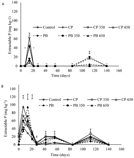 Concentrations of extractable P during incubation of Luvisol (A) and Ferralsol (B) amended with biochar from cull potato (CP) and pine bark (PB) produced at varying pyrolysis temperatures. CP = cull potato; PB = pine bark; CP 350 = cull potato biochar at 350 °C; CP 650 = cull potato biochar at 650 °C; PB 350 = pine bark biochar at 350 °C; PB 650 = pine bark biochar at 650 °C. The vertical error indicates LSD (p < 0.05).