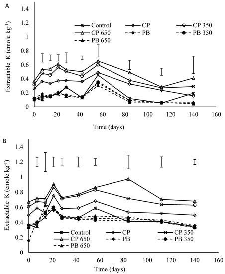 Addition of CP feedstock and its biochars (CP350 and CP650) to soil significantly increased extractable K concentration when compared to PB feedstock, its biochars (PB350 and PB650), and the control treatments for both soils and at all sampling periods (Figure 8A,B). The increase in extractable K was greater for higher temperatures (CP 650 °C > CP 350 °C > CP) for both soils. Pyrolysis temperature did not affect extractable K in treatments with PB biochars. Although the results appeared to fluctuate between sampling periods, there was no major change throughout the incubation. Generally, the Ferralsol had higher extractable K than the Luvisol throughout the experiment.