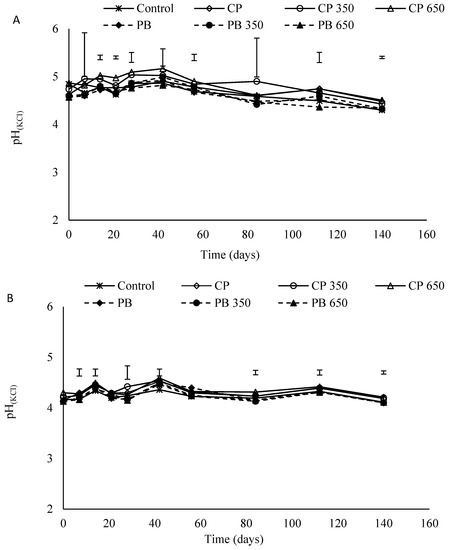 The pH (KCl) during incubation of (A) Luvisol and (B) Ferralsol amended with biochar from cull potato (CP) and pine bark (PB) produced at varying pyrolysis temperature. CP = cull potato; PB = pine bark; CP 350 = cull potato biochar at 350 °C; CP650 = cull potato biochar at 650 °C; PB 350 = pine bark biochar at 350 °C; PB 650 = pine bark biochar at 650 °C. The vertical error indicates LSD (p < 0.05).