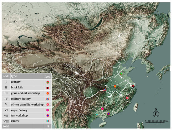 Eight rural industrial heritages of five different types were selected for the study (Figure 1). These cases include typical examples of Chinese rural industry, such as brick kiln, warehouse, military factory, quarry tea factory, and agricultural and sideline product processing facilities. These cases also represent the local people’s production choices and adaptive solutions, in response to different mountains and water conditions. With the urbanization process, most rural industrial production has declined. Whatever the function or type, rural industrial production faces the challenges of starting over, considering the local conditions. In addition, the current rural revitalization policy, as an irresistible external force in rural society, has been forcing the regeneration or disappearance of heritage in China [34]. Those heritage projects that are more prominent and attractive, in terms of scale, historical, socio-cultural, and economic value, are at the forefront of promoting the revitalization of rural industrial heritage. Therefore, the cases selected for this article were projects that had been updated, for which the design results and core description texts have been published. These projects come from different architects and landscape designers, who show their understanding and corresponding solutions to local conditions from different perspectives, including people–land relations, daily life, economy, community relations, and ecosystems. These projects are the typical representatives of the current state of China’s rural industrial heritage. The different features of these cases help to provide evidence of the diversity of real situations in the study samples, thus reducing the impact of the specificity of individual cases on the accuracy and assessment of the study results. Furthermore, different intervention programs support summarization of the universality and demonstration of the regeneration patterns associated with rural industrial heritage.