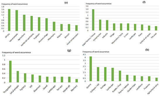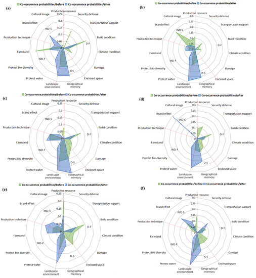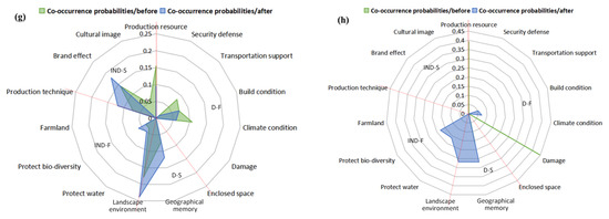 In terms of indirect relationships, the roles of mountains and water, in terms of the functional and spiritual aspects of the renovated rural industrial heritage, were generally more important than before. Water protection, bio-diversity protection, and brand effect became more prominent after regeneration. In particular, biodiversity protection became more important after the regeneration in the Quarry (VIII) case, while the importance of farmland was basically unchanged. The production techniques used in the Oil tea (V) and Tea workshop (VII) cases became more important than before.