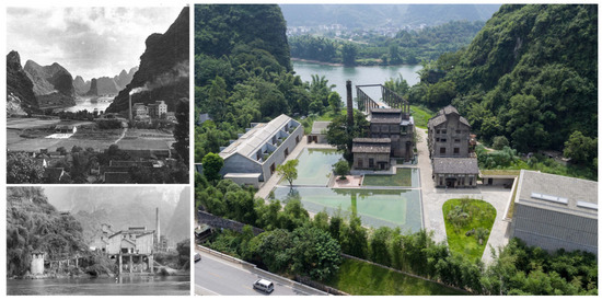 In the past, some rural industries which directly use mountains and water as production materials have caused damage to the local ecological environment. Changing this unfriendly relationship is an important pre-requisite for regenerating such rural industrial heritage. Replacing the original function with an ecologically friendly new one that matches modern life is the first step to changing this relationship. The new function does not involve the erasure of original historical information and local heritage characteristics but, instead, restores the natural ecosystem of mountains and water based on the elimination of unfriendly factors. In this way, heritage is no longer an artificial element, isolated from the local natural environment, but works together with mountains and water to constitute a sustainable habitat that can be perceived and experienced. The heritage needs to be reshaped into a functional landscape with historical and cultural traces, in order to enhance the readability of the local environment for the public [78]. For example, in case VI, the sugar factory was transformed into a hotel named “sugarhouse”, which has become a famous brand. On the basis of maintaining the original landscape pattern, the renovation was carried out by adding pools and strengthening the axis relationship between the building layout and the mountains and rivers. The old factories and transportation equipment are inlaid in the surrounding mountains and Li River, becoming the focus of the landscape. Heritage and nature create a place with a strong monumental atmosphere. Mountains and water, as the background, together with heritage, constitute an attractive space with the ecological values of nature (Figure 5). In case VIII, a negative situation (i.e., the destruction of hills caused by the quarry) is a significant characteristic of the site. Disparate and desolate artificial traces are preserved as landscape elements of the garden. Rather than being deliberately covered or shaded with trees, these quarries form an impressive habitat with diverse vegetation. In this case, the hills and pools, expressed as garden landscapes, return to the ecological laws of the natural environment with the surrounding free-growing plants [74] (Figure 6).