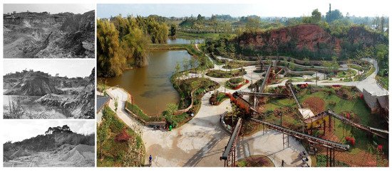 - Wang, X.; Lin, Q. The Revealing and Reconstitution of Landscape: Quarry Gardens in Nanning Garden Expo Park. Chin. Landsc. Archit. 2019, 35, 24–33. [Google Scholar] [CrossRef]