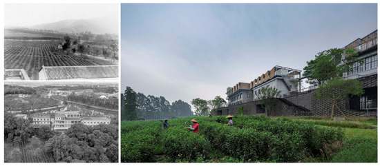 Those rural industrial productions that rely on traditional craftsmanship to establish relationships with the land without the participation of modern machinery make their production process essentially an accumulation of sustainable experience. As the only element to construct human–place relationships, the traditional production activity shapes the local characteristics of rural industrial heritage through the direct or indirect roles of mountains and water [79]. Therefore, maintaining the original function of heritage is not intended to obtain better economic benefits by restoring productive activities, but to re-establish the organic interactions between heritage, daily production, life, and nature. These traditional production activities are inherently ornamental and experiential. They preserve the memories of the local people and present a dynamic landscape mixed with artificiality and nature for the public. Taking case V as an example, the water mill power device and traditional oil extracting process were restored, in order to transform the original production space into tea oil production experience and leisure spaces, shared by residents and tourists. With the architectural intervention of acupuncture, tourist visits and experiences are integrated with villager activities in a unified place-scale with spatial pattern composed of mountains and water [64] (Figure 7). The harmonious relationship between static heritage and dynamic production activities is poetically presented in nature. In case Ⅶ, hills provide slopes and suitable soil for the growth of tea trees. Maintaining the planting, picking, processing, and production of tea for a tea factory maintains the internal relationships between heritage and nature. Tea gardens and tea factories are no longer isolated production spaces but, instead, links between nature, production, life, and rural memory [71] (Figure 8). Traditional handcrafts are activated in these cases, which originate from local mountains and water and are experienced and exhibited in specific local environments. Moderate renewal reinforces the local characteristics of heritage through an open and sustainable approach.
