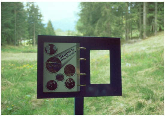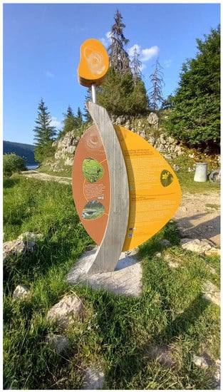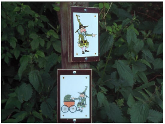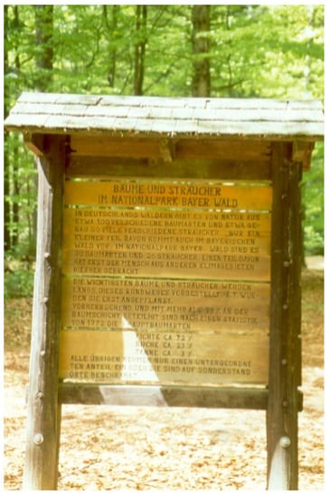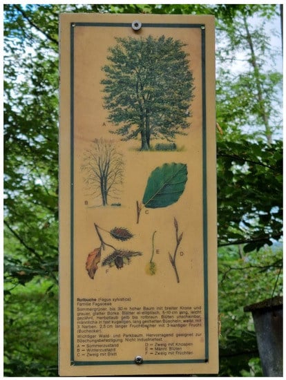 After a prolific educational trail boom in the 1970s, critical voices were increasingly heard in the 1990s. More specifically, the often didactically insufficiently prepared texts (Figure 7) and the offer of “ready-made” nature trails, which often could be found without any local reference in the whole of the Federal Republic of Germany, raised justified doubts whether the conventional nature trails could meet the expectations placed on them. Studies [15,55,63,64,65] confirmed these concerns. For example, only 9% of the people surveyed on traditional nature trails in Bad Herrenalb had taken note of all the panels. Some people had not even registered that they were on a nature trail [64]. In the Geoparks Bergstraße-Odenwald and Vulkaneifel, 14% of those interviewed on geotrails had not noticed the panels. Of those who had noticed the signs, 40% had not read them or had read them only rudimentarily. The reasons given for this were “lack of interest” and design features such as “too much text” or “we already know”. Those who had read the signs found them predominantly informative and attractively designed. However, only 5% of the visitors had come to the geoparks for the educational sites [15]. Similarly, in the Altmühltal, the nature trails were not sought out specifically, but were used as hiking trails. The “experiential value” of the nature trails and their attractiveness for families was rated low [63]. The nature trails also proved to be less successful in terms of environmental education. Even people who had demonstrably read the panels could not remember the contents two hours later, as studies in the Bavarian Forest National Park showed [66]. Due to the purely receptive transfer of knowledge, the “traditional” nature trails also did not succeed in conveying a value for the natural phenomena to the visitors and thus motivate them to work for the preservation of these phenomena.
