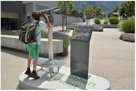 Case study: The Illgraben information post in Susten (Switzerland) (Figure 3) illustrates how latent interest can be addressed, how easy access to the content can be created, and how different information [46,47] needs can be addressed: Susten is located in the Pfyn-Finges Regional Nature Park. An extremely dynamic debris flow system is active in the municipality (several debris flows per year), which has long been monitored for research and warning purposes [48]. The Regional Nature Park, in cooperation with the municipality and the tourist office, wants to use the information post to sensitise visitors and locals—including many newcomers—to this geomorphological process and the correct way to deal with debris flows. The information post is located on the heavily frequented station square. With an imposing stone block from the Illbach, a replica of an alarm station and a telescope, three foreign objects surprise passers-by. The deliberately placed small-format panels, supported by generous illustrations and short texts, convey the basic content. The direct reference to the Illgraben is established by the stone block and a telescope, which allows direct observation of the erosion funnel. The panels also mention that further information is available at the adjacent tourist office if interest is generated [35].
