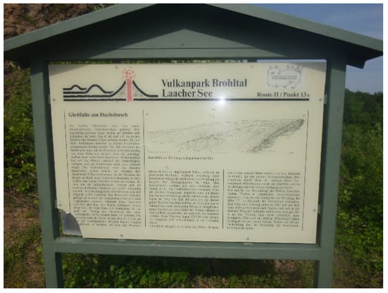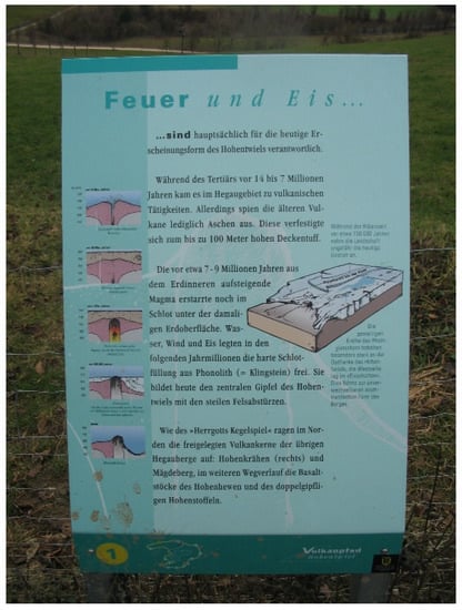“Education at all levels is at the core of the UNESCO Global Geopark concept” [13]). This educational work is essential to convey an understanding of the need for comprehensive protection of geoheritage. Different educational concepts and instruments can be used for this purpose. At the same time, some of these instruments can also serve as important geotourism opportunities and thus can contribute to regional economic value creation. A frequently chosen mediation tool is a wide variety of trail concepts (educational and experience trails) [7,14,15,16]. Well-designed geotrails link local geodiversity, geoheritage and geoeducation, which makes them highly attractive for geotourism. Unfortunately many trails do not take into account at all or not sufficiently recent didactic and touristic findings. As a result, they fail both to interest a lay audience in geological phenomena and to convey relevant information, and to attract tourists to the region.