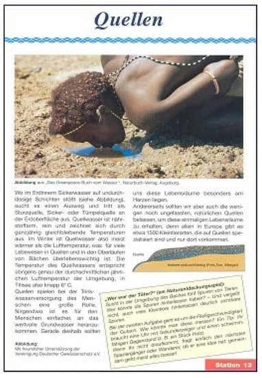 Self-guiding trails can be supplemented with additional activities. For example, a brochure was prepared for the Spring Experience Trail in Bad Herrenalb, which contains additional activity suggestions and is intended to enable group leaders, in particular, to prepare a tour of the trail. In addition, guides were trained to offer guided excursions along the trail, mainly for school classes. For younger children, for whom most of the stations were too demanding, appropriate stations were integrated and a quiz was developed, for which a certificate as a spring researcher is available after successful completion [62].
