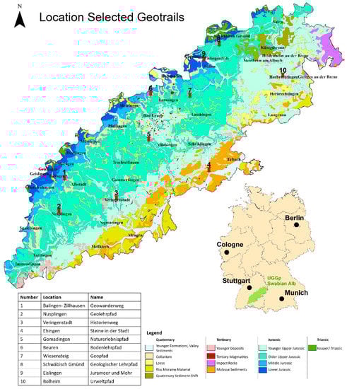 Our case study, the UNESCO Global Geopark (UGGp) Swabian Alb, located in Southwest Germany, is one of the oldest geoparks in the world [17] and features a significant number of geotrails of various types. Within the framework of a small research project, a catalogue of state-of-the-art criteria to evaluate existing geotrails was elaborated on the basis of a previous SWOT-Analysis, comprehensive literature research and subsequently verified on the basis of exemplarily selected trails in the Geopark Swabian Alb. Finally, recommendations for model geotrails were derived (Section 2.4.3). The term “model” refers in this case to aspects of geoeducation as well as geotourism. The results of the research project will hopefully provide guidance to geoparks and other institutions. Additionally, the tools to design such trails and to maintain high standards are included.