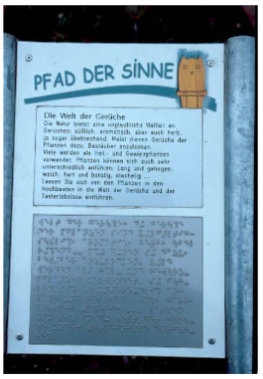 In recent years, the use of digital technologies in (informal) education also has been on the rise. Apart from offering different levels of information via QR code or texts in other languages without overloading panels, virtual realities, interviews with contemporary witnesses, etc. can be included [71]. Moreover, this is more likely to reach younger and new target groups [14]. In addition to numerous advantages, digital technologies also have a number of disadvantages. These can include the sometimes-high costs of programming virtual realities and the terminal equipment required for optimal presentation; the necessary expertise, but also vandalism or weather damage if the corresponding facilities are located outdoors. QR codes as a relatively low-threshold digital possibility to offer additional information have failed on site due to insufficient network availability and possibly due to aversions of certain target groups (e.g., older people) to work with technical devices in nature. While for many, especially younger people, the use of digital media is a matter of course (“digital natives”), this is not the case for many, especially older people, so that they are excluded by corresponding installations. This is equally true for people who do not have the corresponding end devices, e.g., for financial reasons.