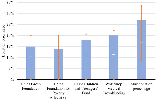 Figure 1 describes the herders’ altruism levels. For more detailed information on the herders’ altruism levels, the reader should refer to Table A3 in Appendix A. The herders paid the most to Waterdrop Medical Crowdfunding (9.3 yuan per household, equal to 20% of their endowment), followed by the China Children and Teenager’s Fund (8.24 yuan, or 18%), China Green Foundation (6.97 yuan, 15%), and China Foundation for Poverty Alleviation (6.6 yuan, 14%). The maximum donation amount was 13.1 yuan per household, accounting for 27% of the herders’ endowment.