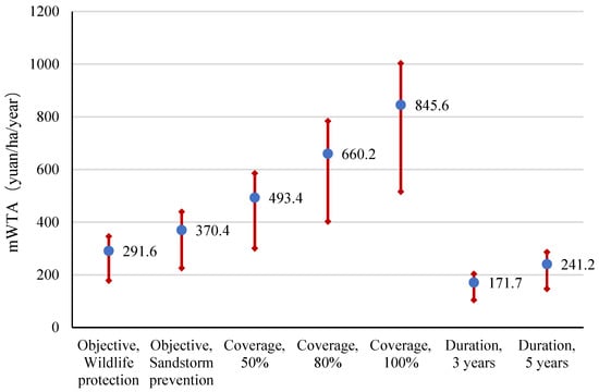 Firstly, we report our main results from the conditional logit models in Table 3. Column (1) represents the coefficients estimated from Equation (5). A negative coefficient means that the herders are less likely to participate in a ban policy as the attribute transitions from the baseline to a specific level, while a positive coefficient indicates that they are more willing to participate. As the estimated coefficients cannot be interpreted directly, we calculated the marginal effects and presented them in column (2). The marginal effect can be interpreted as the change in the likelihood that the herders will accept a ban policy when the attribute transitions from the baseline to a specific state. Finally, we calculated the marginal willingness to accept (mWTA) the policy using Equation (8), measured using the percentage of the village-level grassland rental price. We then transformed the percentages into absolute values by multiplying them by the village-level rental price, and we presented the mWTA in Figure 2.