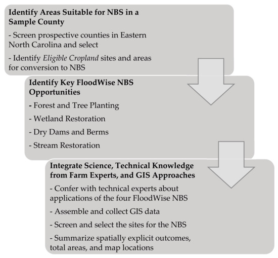 This paper augments some of the preceding research and focuses on the methods and applications for the integration of remote sensing, Geographic Information (GIS) Systems, and expert and professional knowledge and inputs in order to develop spatially explicit maps to identify and select tracts that can be used for NBS practices in rural North Carolina. The objective of this effort was to outline the methods that can be used to select NBS locations in the state, so the development of the methods, as well as our summary of their results, are commensurate outputs from this research. Accordingly, both are covered in detail here.