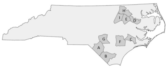 Locations of nine counties assessed as a potential study area: Robeson County (A); Columbus County (B); Jones County (C); Martin County (D); Edgecombe County (E); Duplin County (F); Cumberland County (G); Halifax County (H); and Nash County (I).