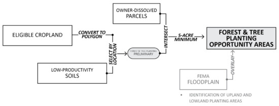 Afforestation involves transitioning agricultural land from row crop or pasture production to forest lands, either actively managed for forest products or as a restoration activity. Agroforestry practices also fall into this category and integrate tree production with traditional row crop agricultural operations and livestock husbandry. Agroforestry practices may increase income for farmers, particularly on sites with poor soil [42]. Suitable sites for forest and tree planting were determined to have low-productivity soils, owned by a single entity, and consisted of at least five acres (2 ha) in area (Figure 6).