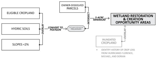 Diagram illustrating the general process of geospatial analysis for identifying Wetland Restoration and Creation opportunities.