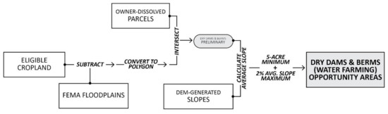 Installing dry dams and berms creates a catchment area for the storage and controlled release of floodwaters, a practice also called water farming. Unlike wetland restoration as a flood reduction practice, crop production within the constructed catchment area is not impacted during dry times. Farm operations can continue on the land, but crops grown in the catchment area are completely inundated during flood events. Sites suitable for water farming were located outside of the floodplain with mean slopes below 2%, owned by a single entity, and at least five acres in area.