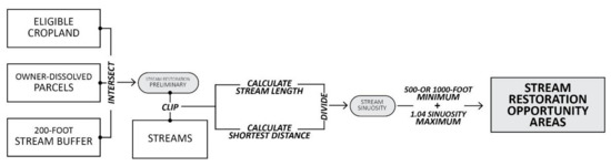Diagram illustrating the general process of geospatial analysis for identifying Stream Restoration opportunities.