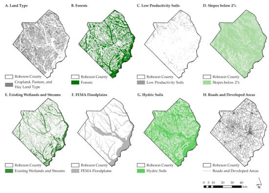 Results of Robeson County inventory mapping including: cropland, pasture, and hay (A); forests (B); low-productivity soils (C); slopes below 2% (D); existing wetlands and streams (E); FEMA floodplains (F); hydric soils (G); and roads and developed areas (H).