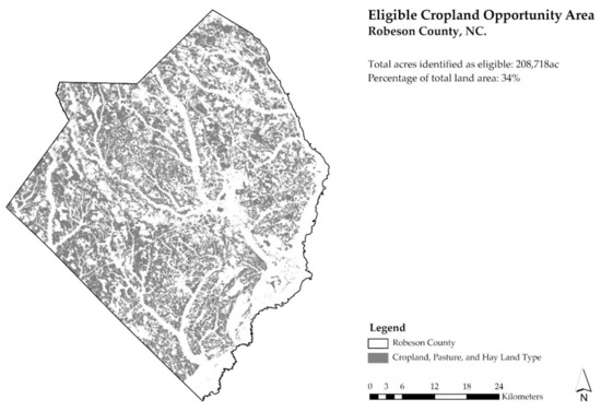 The crux of this research was to identify areas where NBS could be applied in Robeson County, North Carolina. This essentially required detailed identification and mapping of sites with eligible cropland that could be converted to NBS. These selection and mapping methods are reported here to document replicable methods for other NBS research and development efforts.