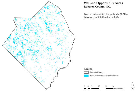 Slopes below 2%: Water generally flows at slopes greater than 2% and pools at slopes less than 2%. Water storage is a critical function of wetlands which provides water quantity and quality benefits, including reducing soil loss and erosion, nutrient and sediment filtration, groundwater recharge, and floodwater storage. Areas with lower slopes are naturally better suited to store water, and likely will not require extensive structural alterations or interventions to facilitate water storage. A slope raster for Robeson County was generated from the clipped Statewide 20-foot Digital Elevation Model (DEM) produced by the North Carolina Flood Mapping Program [50]. The clipped dataset was reclassified to include only areas with slopes less than or equal to 2%.