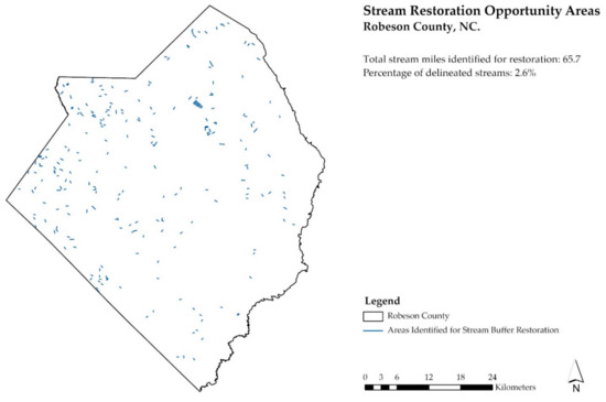 Minimum Length: Prioritizing longer stream segments for channel restoration will have a greater impact on flood control and water quality. Recommendations for an appropriate minimum length for stream restoration vary, so two minimum stream lengths were evaluated for this analysis: 500 feet (152 m) and 1000 feet (304 m). The extent of work for any proposed restoration projects would not necessarily need to meet these length minimums. However, identifying more extended stream reaches where restoration would be beneficial allows for greater flexibility for site-level analysis, design, and scoping of restoration projects. NCDOT uses the 1000-foot minimum stream length criteria for identifying restoration projects [51]. This threshold was used as the foundation for the Robeson County analysis but produced somewhat limited results, so the analysis was rerun to lower the minimum stream length threshold to 500 feet.