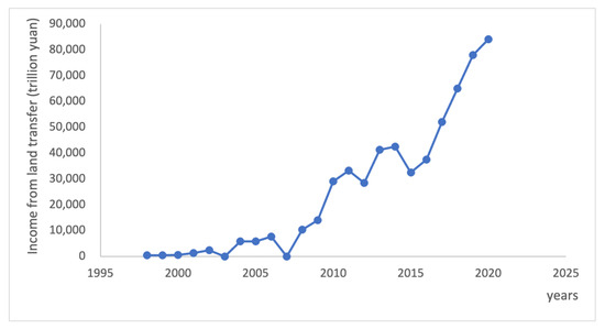 The reform of the tax-sharing system in 1994 apportioned land income to local governments, laying the institutional groundwork for local governments to transition to “land finance”. Since then, relying on the monopoly of the primary land market, the local government has acquired agricultural land at a low price and then sold it for a profit after leveling and developing it [21]. This allows for the collection of a substantial amount of land-transfer fees, which can be used to acquire new land and combine funds for urban construction. Currently, a majority of cities are overly dependent on land-tax revenue. According to the Ministry of Finance’s annual fiscal revenue and expenditure data, national land sales’ revenue in 2021 reached CNY 5.6 trillion, accounting for 27.65 percent of the national general public budget revenue, 50.42 percent of the local general public budget revenue, and 32.43 percent of the national-tax revenue. According to the 1998–2020 China Land and Resources Statistical Yearbook (Figure 1), local government land-transfer income grew at an average annual rate of 49.9 percent, from CNY 50.77 billion in 1998 to CNY 1.04 trillion in 2008. In 2021, the local government’s land-transfer revenue amounted to CNY 8.71 trillion, representing 50 to 60 percent of the local public finance revenue.