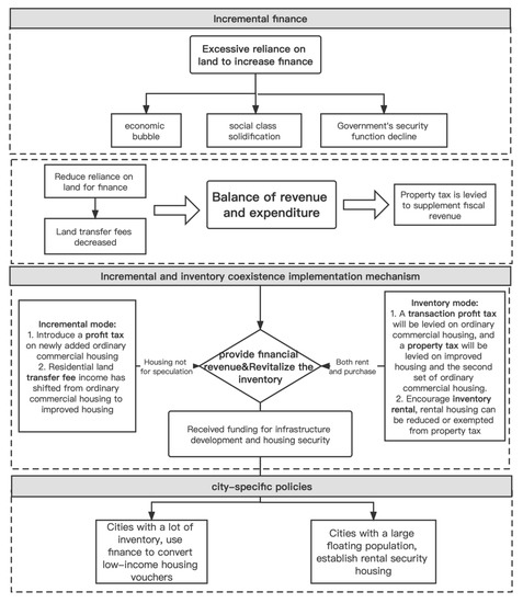 “Land financing” is a particular system created to solve the lack of original credit in the early stages of urbanization. When the initial accumulation of capital has been completed, the reliance on land increments must be gradually phased out and replaced with a more sustainable growth model [52]. How to transform land incremental financing into land inventory finance and make land inventory finance function normally is crucial for high-quality development in the current context of common prosperity. The objective of inventory planning differs from how to allocate and combine resources for optimal public service level in incremental planning. To maximize social benefits, the objective is to transfer existing resources to users who can contribute the most to the city, while also minimizing the cost of factor transfer. One solution would be to switch from “land finance” to “tax finance” and impose property taxes on improved housing and second sets of ordinary commercial housing. The goals are to promote the rental of inventory, to encourage the purchase of improved housing, to encourage the second set of commercial housing households to rent out their original houses, to reduce or even exempt property tax for rented commercial housing, to revitalize the inventory and give full play to the housing function, and to ultimately realize both rental and purchase.