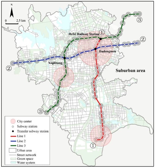 As the capital city of Anhui Province, Hefei City has been experiencing rapid urban development since 2010. The permanent population of Hefei had reached 8.189 million by the end of 2019, an increase of 102,000 over the previous year according to the data of the Hefei Municipal Bureau of Statistics. It is estimated that the urbanization rate of Hefei will reach 90–95% by 2030 [12]. The traffic congestion in Hefei is becoming more serious with the increase in the population and the expansion of the city. The number of private cars in Hefei has increased by 12.6% over the previous year to the end of 2019 [13]. If the demand for private cars is not effectively controlled, the problems of traffic congestion and exhaust emissions will become increasingly serious. Therefore, Hefei City operated the subway system and introduced the TOD concept as a guideline to reduce traffic pressure and environmental pollution in 2017.