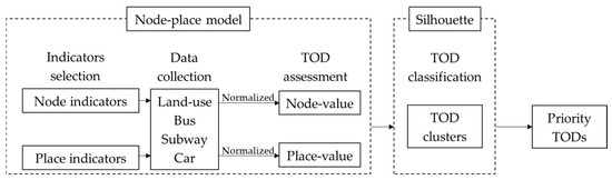 In this section, first, the node–place model is used to evaluate the existing TODs. Secondly, the priority TODs are determined by applying the silhouette model. The following is the research flow chart (Figure 2).