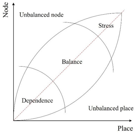 The basis for finding TODs that can be given priority is to accurately evaluate each TOD. Therefore, developing a practical tool that measures the TODs is important. The node–place model [25] is a common method used to evaluate TODs. This model describes the transport nodes, the surrounding area, and the relationship between them with the x and y axes, shown in Figure 3. The y value represents the accessibility of nodes; the x value expresses the activity intensity of the surrounding area. The original node–place model provides five assumptions, namely “balance”, “dependence”, “unbalanced place”, “unbalanced node”, and “stress”. Bertolini [25] also indicated that there is a trend toward a more balanced state for “unbalanced place” and “unbalanced node”. In general, the node–place model could be used as a systematic method to measure the development situation of TODs by evaluating the accessibility and activity intensity. It could help identify the weakness of TODs as well.