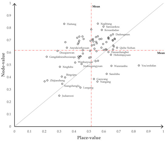 Through the calculation of node- and place-values, a node–place graph was obtained as shown in Figure 4. The application of the node–place model to the Hefei City reveals differences between the node- and place-values of the 77 TODs. The node-value varies between 0.25 and 0.83, with a mean value of 0.62. The place-value varies between 0.20 and 0.84, with a mean value of 0.52. The average node-value is higher than the average place-value. This shows that the mean node-value is higher than the mean place-value, which indicates that the transport infrastructure development of Hefei TODs is better than that of the surrounding environment.
