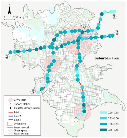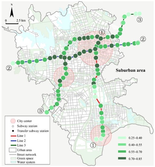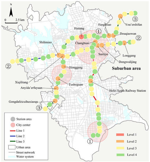 By 2020, there were 3 subway lines and 77 subway stations operating in Hefei. So far, the subway has occupied an important position in people’s daily travel. According to 2019 statistics, the total passenger volume of the Hefei subway was 179.8 million person-times, and the public transportation share rate was 19.06%. The share of public transport increased to 26.02% by February 2020. The subway has gradually become the backbone of Hefei’s public transport system. In this study, the 77 TODs, composed of 77 subway stations and their surrounding urban development, were selected for analysis, as shown in Figure 1.