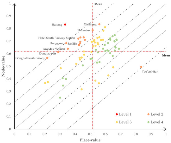 The minimum distance from each station to the middle line of the node–place graph can be calculated based on the node- and place-values already obtained, and the range of distance was from 0.0024 to 0.3523 in Hefei City. Then, the silhouette coefficient was used to determine the priority development level at each TOD. The silhouette score was largest when the number of clusters was four, which indicates that it is suitable to divide 77 TODs into 4 clusters. The priority levels of the clusters depend on their distance from the middle line. Level 1 in Figure 7 has the highest development priority. Figure 7 shows the distribution of the four priority levels in the node–place model. There is only one TOD at priority level 1. There are 14 TODs in priority level 2, 30 TODs in priority level 3, and 32 TODs in priority level 4.