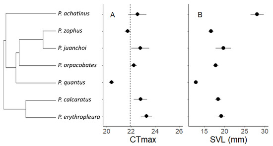 Pristimantis frog phylogeny. (A) Mean CTmax ± SE per species. Dash line represents mean CTmax across all seven species. (B) Mean SVL ± SE per species.