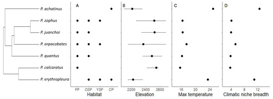 Pristimantis frog phylogeny and (A) their habitat (PF: primary forests; OSF: old secondary forests; YSF: young secondary forests; CP: cattle pasture), (B) mean (point), minimum and maximum (black line) elevation where they were collected, (C) mean ± SE daily maximum temperature they experience, and (D) mean ± SE climatic niche (calculated as maximum ambient temperature minus minimum ambient temperature).