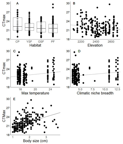 Relationship between Pristimantis frogs’ CTmax and (A) habitat (CP: cattle pasture; YSF: Young secondary forests; OSF: Old secondary forests; PF: Primary forests), (B) elevation, (C) maximum temperature, (D) climatic niche breadth, and (E) body size (snout-vent length). Solid lines represent significant relationships (p < 0.05).