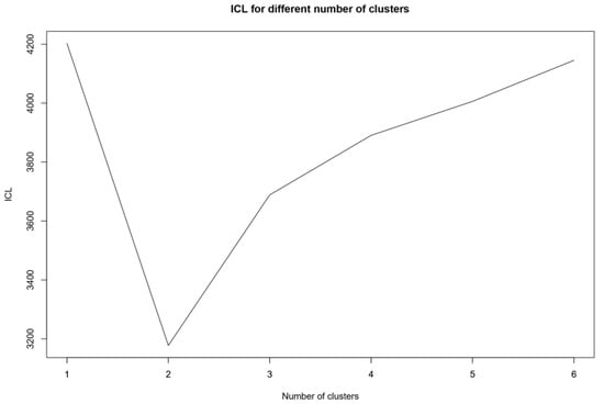 In order to select a model where in addition to the model fit the ability to define well separated clusters is taken into account, the integrated complete likelihood (ICL) criterion can be used. According to [], the ICL can be expressed as BIC with an additional entropy penalty term as follows: