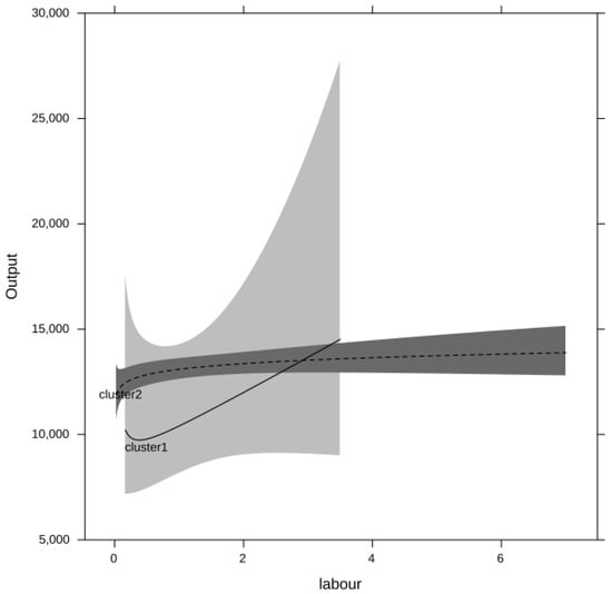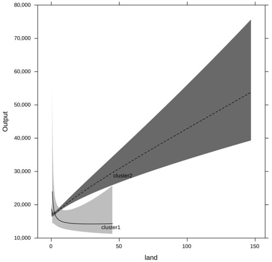 Yet, our estimation suggests that in spite of looking very similar, the two clusters have very different production functions. Due to the non-linear functional form of these, however, comparing estimated coefficients would be impractical and non-informative. A reliable way to compare two non-linear functions is by comparing their partial correlation plots. This amounts to using the estimated models to predict the dependent variable (i.e., output) and then plot the predicted values against the values for a given factor by keeping the other factors fixed at ‘typical’ values. In this way, we can visualize the effect of a given production factor when the rest of the inputs are kept fixed. The first issue is what would be the reasonable values for the fixed inputs. This would depend on the purpose of the above plot. If the interest is in average effects, using the average values over the estimation sample would be an easy way to achieve ‘reasonable values’. Sometimes averaging would not be a reasonable strategy, in particular in the case of discrete values (see, e.g., []). In the present study, all the inputs are continuous variables, therefore, averaging over the estimation sample is used as a viable option.
