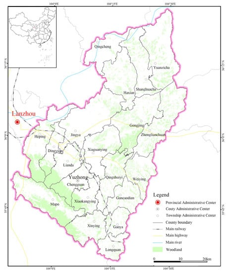 Yuzhong County is located from 103°49′15″ E to 104°34′40″ E and from 35°34′20″ N to 36°26′30″ N, which is the intersection of the Loess Plateau and Qinghai–Tibet Plateau and three natural areas (Figure 1), with a length of 92 km from north to south and a width of 54 km from east to west, with a total area of 3302 km2. Yuzhong County belongs to a temperate semi-arid climate, which is arid in spring, hot in summer, rainy and cool in autumn, and cold and dry in winter, with an average annual temperature of 7.5 °C, annual rainfall of 428 mm, evaporation of 1343.1 mm, and an average annual wind speed of 1.5 m/s. There are rich water resources, the annual total runoff of surface water is 53.49 × 106 m3 and the total reserve of groundwater is 940 × 106 m3. The altitude is 1480–3670 m, the terrain is high in the south and low in the north, and the middle is low-lying, showing a saddle shape.