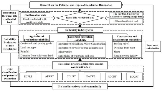 From the perspective of land use characteristics, idle residential land refers to the idle situations caused by uninhabited or unused buildings or appendages on its ground in a certain period of time, mainly including the rural residential land of “One Household with Multiple Houses”, building new houses without demolishing old ones, and houses with dilapidated appearance and collapsed houses [35,36]. In China, rural residential land refers to the collective construction land that rural villagers enjoy based on their membership in the collective economic organization (administrative village or production team) and that can be used to build houses. It implements the management system of “One Household with One Houses”. Confirmation of the right to use residential land refers to the right of rural residents to occupy and use their own collective land for the construction of their own residential houses. “One Household with One House” should be insisted upon. The residential land occupied other than “One Household with One House” should not be confirmed for registration, and the occupied residential land exceeding the “One Household with One House” policy is regarded as illegally occupied land. In the investigation, it was found that most of the residential land that has not been confirmed for registration in Yuzhong County is “One Household with Two Houses”, or even “One Household with Multiple Houses” in which the old houses have not been withdrawn and new ones have been built. This study assumes that they are idle residential land that can be renovated. This paper mainly includes three sections of research contents: identification of idle residential land, suitability evaluation of rural land, and classification of idle residential renovation types (Figure 2).