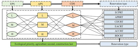 (6) Balanced development comprehensive renovation type. This renovation type mainly includes L-L-L, M-M-M, H-H-H, L---L residential renovation. This means that the suitability value of ecology, agriculture, and construction in the area of idle residential land is at the same level. Integrated and comprehensive measures should be taken to the suitable renovation of the idle residential land into a land-use type for comprehensive ecology, agriculture, and construction use.