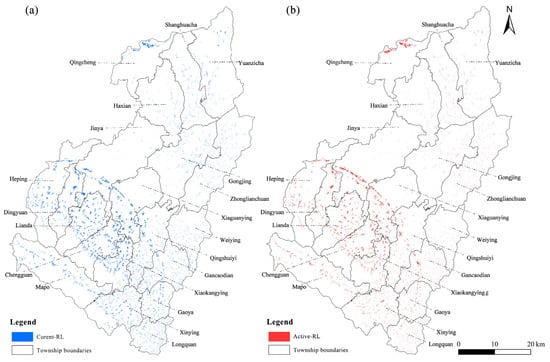 The current situation of the rural residential land in Yuzhong County: (a) the distribution of the residential land in the third land use survey data; (b) the distribution of the confirmed rural residential land.