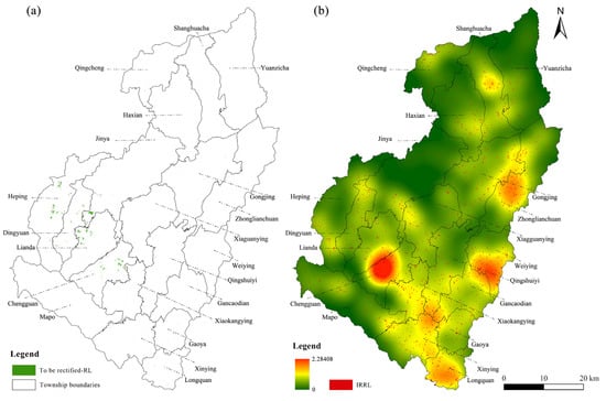 The spatial distribution of the idle residential land in Yuzhong County: (a) the spatial distribution of the idle residential land; (b) the kernel density analysis of the idle residential land.